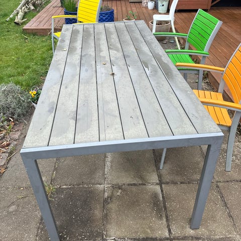 Det er ca 8 år gammelt og står udenfor. Det bliver rigtig pænt, når det tørres over med en klud.