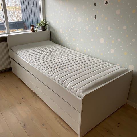 IKEA seng med skuffer i hvid. Sengen har integreret opbevaring med flere skuffer under liggefladen samt åbne hylder i den ene ende. Sengebunden består af lameller. Overfladen er i hvidt materiale, og der kan forekomme mindre brugsspor på fronten af skufferne, som vist på billedet. Velegnet som enkeltseng med ekstra opbevaringsplads i soveværelse eller børneværelse.