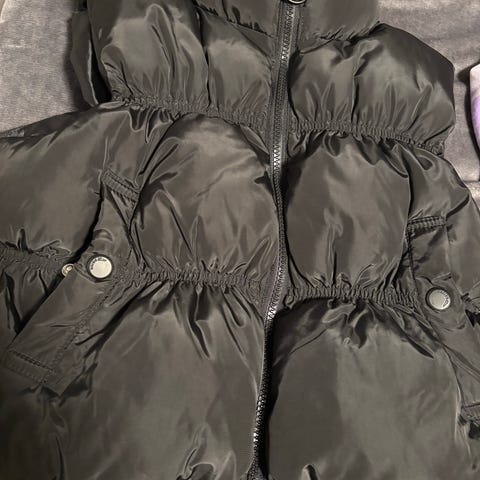 Flot sort dynevest i str. S. Lidt oversized i str. Går til lige under hofterne. Fejler intet