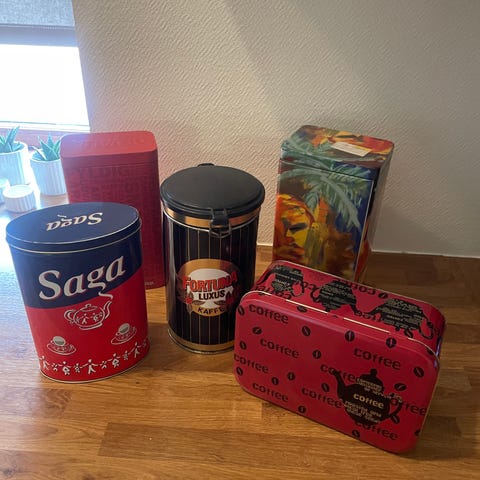 Blandet parti dekorative dåser til opbevaring. Sættet består af tre forskellige dåser i metal og blik, herunder en høj rektangulær pastadåse med motiv, en rød cylindrisk dåse og en mindre cylindrisk dåse med britisk flagmotiv. Dåserne kan anvendes til opbevaring i køkkenet eller som dekoration. Velegnet til tørvarer, småting eller som samlerobjekter.