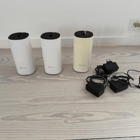 TP-Link Deco M5 mesh wi-fi system i hvid. Systemet består af runde enheder, der arbejder sammen for at give trådløs netværksdækning i hjemmet. Enhederne tilsluttes strøm og netværk via medfølgende adaptere og netværksporte på undersiden. Velegnet til at udvide wi-fi-dækningen i flere rum eller etageejendomme, hvor der ønskes stabil trådløs forbindelse i hele boligen.