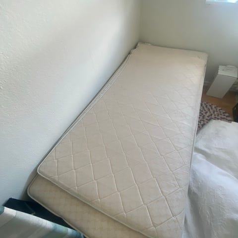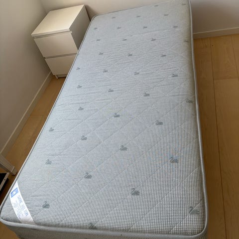 Hilding Basic boxmadras i single-størrelse. Madrassen er en boxmadras med indbygget fjedersystem og fasthed markeret som medium/fast på etiketten. Betrækket har et ternet mønster i gule, blå og hvide nuancer. Madrassen står på træben med buet form, som giver fri plads under sengen til opbevaring eller rengøring. Velegnet som enkeltseng i soveværelse, gæsteværelse eller sommerhus. Måler 80x200 cm. Fremstår helt ny. Kun brugt til gæste seng få gange. Incl Topmadras.