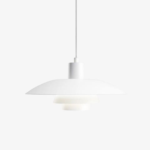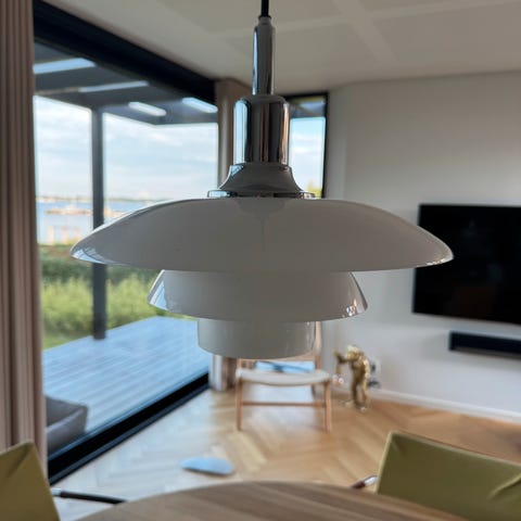 Louis Poulsen PH pendel designet af Poul Henningsen. Loftlampen har flere skærme i hvidt metal, der er udformet til at give et blændfrit og jævnt fordelt lys nedad. Pendlen har kromfarvet ophæng og er velegnet over spisebord, køkkenbord eller som generel rumbelysning. Passer til standard lyskilde med fatning i midten af lampen.