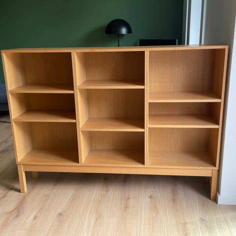 Klim 6980 åben bogreol i eg/finer med 14 hylder, der kan justeres i hylde afstand/højde. 2 stk reoler haves. Pris per stk 3.500 - sælges samlet for 6.000. (Nypris 10570 per reol).