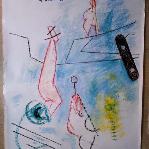 Indrammet kunsttryk med stregtegning i sort og røde markeringer. Motivet er en figurativ komposition udført på hvid baggrund. Værket er monteret i enkel ramme med passepartout, velegnet til ophængning på væg i stue, kontor eller galleri-lignende omgivelser.