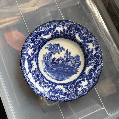 Engelsk fajance, dyb tallerken med motiv af Amalienborg Slot.