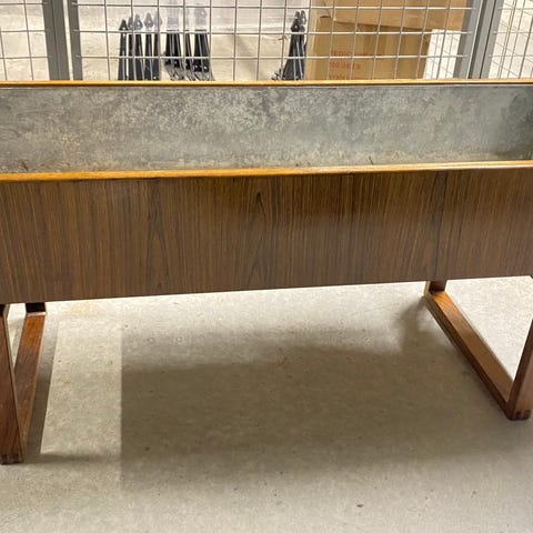 2 Skt.s Arcano rektangulær. Plantekassen er aflang og dyb, egnet til udendørs brug i have eller på terrasse. Overfladen fremstår med patina og rust, som giver et råt, industrielt udtryk. Kan anvendes til beplantning, som blomsterkasse eller som dekorativ beholder i haven.