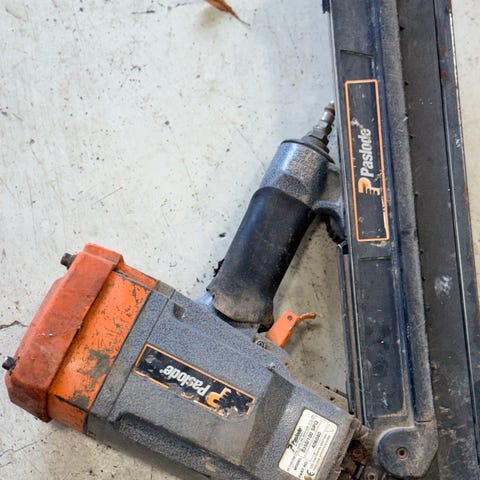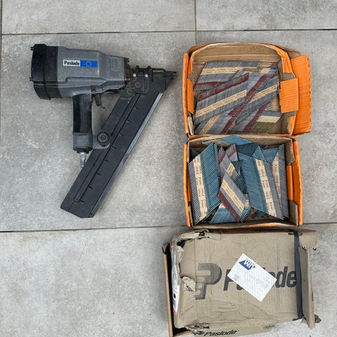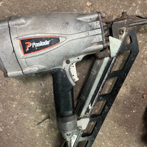 Paslode sømpistol til brug med trykluft. Egnet til sømning af træ- og konstruktionselementer, f.eks. i tømrer- og snedkeropgaver. Pistolen har magasin til søm i skinne og tilslutning til kompressor via standard luftkobling. Velegnet til professionelt og privat brug, hvor der er behov for hurtig og ensartet sømning.