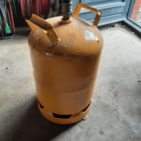 Gasflaske i gul farve. Velegnet til opbevaring af gas til f.eks. grill eller andre gasapparater, afhængigt af korrekt tilslutning og godkendelse. Nærmere specifikationer som størrelse, volumen og tilslutningstype fremgår ikke af billedet og bør kontrolleres ved afhentning eller hos producenten.