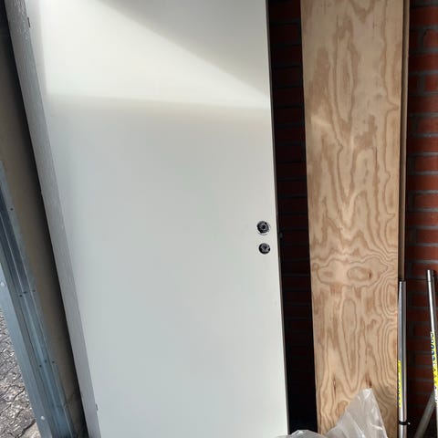 Indvendig dør i hvid med glasfelter samt en massiv hvid indvendig dør. Den ene dør har flere rektangulære glasfelter, som giver lysgennemgang mellem rum. Den anden dør er uden glas og fremstår som en glat, hvid dør med dørgreb og hængsler i metal. Begge døre er velegnede til brug mellem opholdsrum i bolig, fx stue, gang eller værelse.