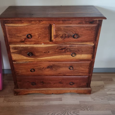Kommode i rødmalet træ med 4 skuffer. Kommoden står på små kugleben og har nøglehuller på alle skuffer. Overfladen viser brugsspor i malingen. Egnet til opbevaring i soveværelse, entre eller stue.