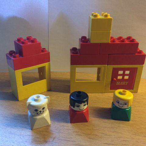 Lego Duplo, 537 Mary's House, Retro legetøj fra ca. 1977. Der mangler 2 gule døre. Døren er ødelagt og 2 af figurerne har også en revne.