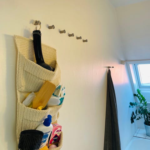 Hængende opbevaring med 3 lommer i beige strikket materiale. Produktet kan hænges på en dør eller krog og giver ekstra opbevaringsplads til f.eks. badeværelsesartikler, småting eller tilbehør. De tre lommer er placeret lodret under hinanden og er åbne foroven, så indholdet er let tilgængeligt. Velegnet til brug i badeværelse, soveværelse eller entré, hvor der er behov for pladsbesparende opbevaring.