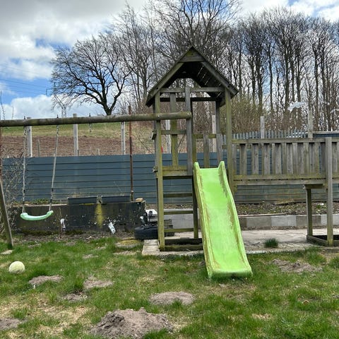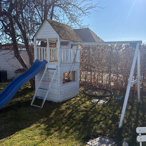Legetøj med rutschebane og gynge. I strukturel fin stand, men er leget på i ti år og bør derfor rengøres.