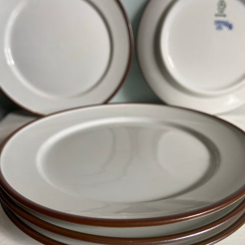8 stk Domino Royal Copenhagen middagstallerken på 24cm med enkel brun kant langs randen. De ser ud som at de aldrig er brugte.