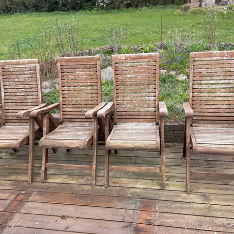 4 havestole i træ. De er tunge og man sidder godt! Malet for 7 år siden, og det skaller af nu, som ses på billederne. De trænger til en maling, i lige den farve du ønsker dig.