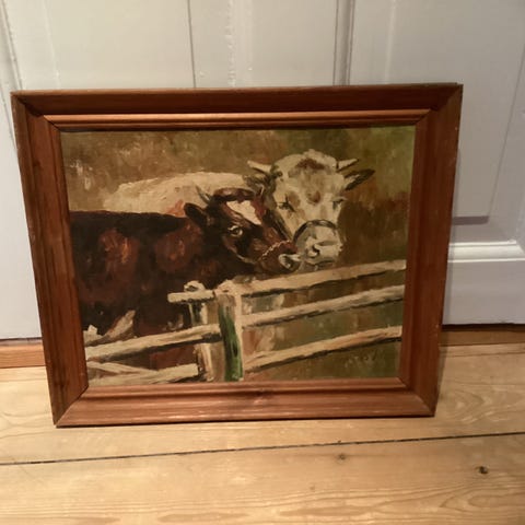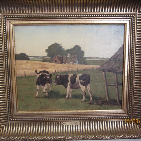 Maleri med motiv af ko i staldmiljø. Billedet viser en sort-hvid ko stående i en bås med halm på gulvet. Maleriet er indrammet i en dekoreret guldfarvet ramme med ornamenter. Signatur ses i nederste hjørne af maleriet. 35 x 29 cm