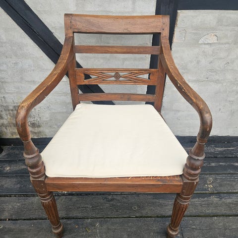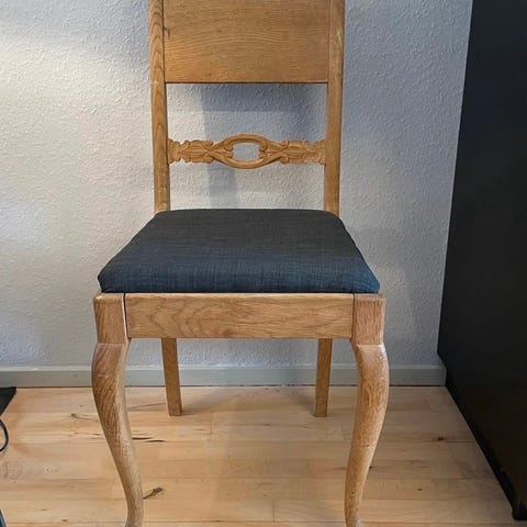 Siddehøjde 46 cm. Bredde 43 cm. Fuld højde 99 cm. Dybde på sædet ca. 35 cm.