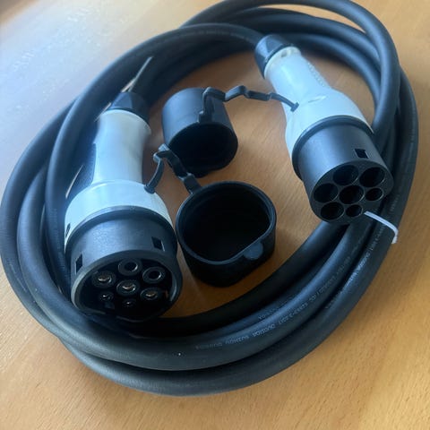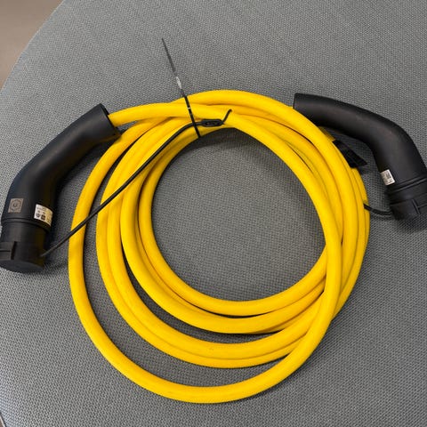 Mennekes ladekabel til elbil med integreret kontrolboks. Kablet har gul ledning og hvid ladestikprop med sort håndtag. Egnet til opladning af elbil via ekstern ladeboks eller stik, afhængigt af bilens og installationens kompatibilitet. Yderligere tekniske specifikationer fremgår af mærkaten på kontrolboksen.
