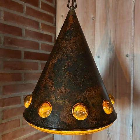 Vintage pendellampe designet af finske Nanny Still McKinney i 1960’erne. Udført i brutalistisk stil med en ydre skal af syret og oxyderet kobber. Lampen er monteret med indsatser af gult, struktureret "bobleglas", som giver en varm og jævn lysspredning.