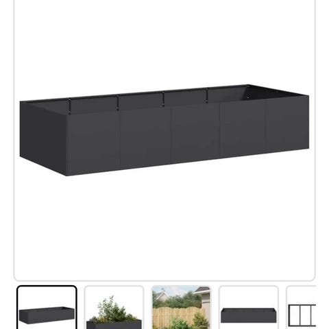 Sort plantekasse i metal egnet til brug på terrasse. Kassen er aflang og dyb nok til beplantning med blomster, krydderurter eller mindre buske.