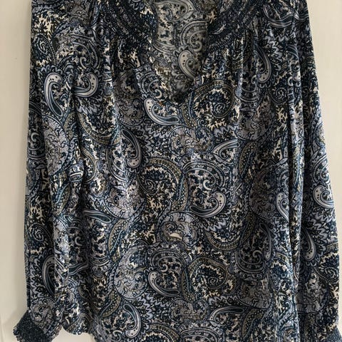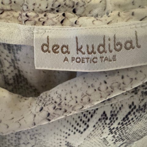 Dea Kudibal bluse i str. M til kvinder. Blusen er fremstillet i silke og har et grønt mønster med kontraststriber og grafiske detaljer. Modellen har lange ærmer og V-udskæring med lille slids foran. Let og tynd kvalitet, der egner sig til både hverdag og mere formelle anledninger afhængigt af styling.