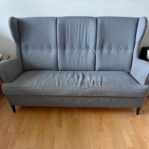 Hent gratis. Hjørnesofa, højrevendt. Den er brugt, og har brugsspor. Kan sikkert repareres, stoffet under sofaen skal spændes fast med hæftepistol. Farve sand/beige