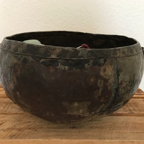 Kobber skål på fod med indgraveret mønster