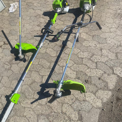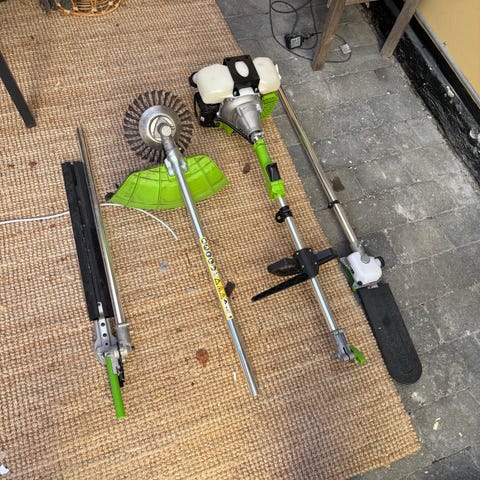 Benzindrevet kombimaskine til havearbejde med udskiftelige redskaber. Sættet omfatter motorenhed med håndtag og sele samt flere skaftdele. Der medfølger blandt andet buskrydderhoved med klinge, trimmerhoved, hækkeklipperdel og kædesavstilbehør til beskæring. Maskinen er egnet til klipning af græs og ukrudt, trimning af kanter, formklipning af hække samt beskæring af grene og mindre træer i haven.