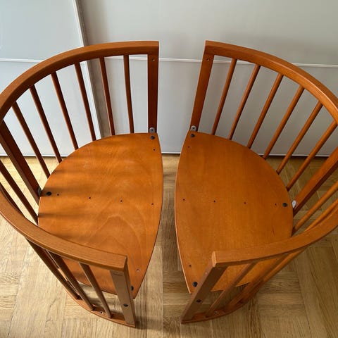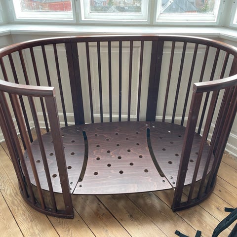 Stokke tremmeseng i træ i naturfarve. Sengen består af buede gavle og sidepaneler med tremmer samt bund med lameller. Formen er oval, og der medfølger en madras tilpasset sengens form. Tremmesengen er egnet til spædbørn og mindre børn og kan anvendes som sovemøbel på børneværelset. Konstruktionen er i massivt træ med afrundede kanter og tremmer for ventilation omkring barnet.