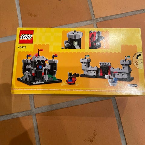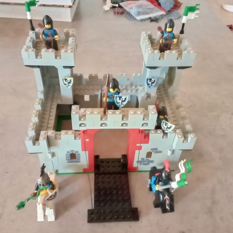 LEGO ridderborg med mindre borgbygning, tårn og flag. Sættet indeholder blandt andet en ridder på hest, ekstra ridderudstyr på stativ samt en minifigur ved borgen. Der medfølger våben og skjolde i forskellige farver samt diverse klodser til at bygge borgmiljøet vist på billederne. Egnet til leg med middelalder- og riddertema.