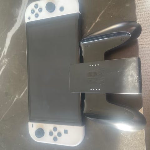 Nintendo Switch OLED konsol i hvid. Konsollen ses med hvid dock, Joy-Con controllere i hvid samt Joy-Con greb. Der medfølger håndledsremme til Joy-Con. Systemet kan bruges både som håndholdt konsol og til spil på tv via docken. Velegnet til én eller flere spillere afhængigt af spil og controlleropsætning.