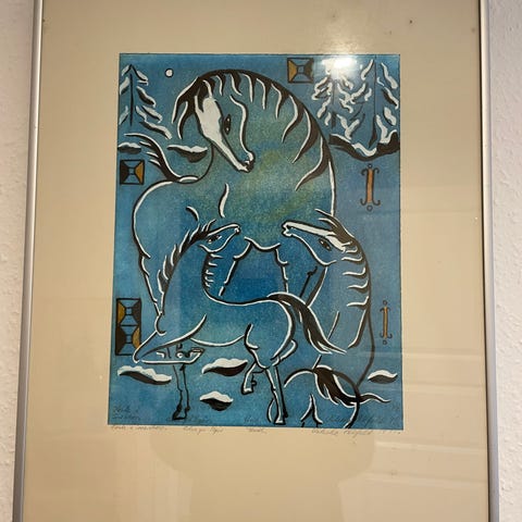 Litografi fra 1985. Signeret. Motiv “Heste og Vindmøller