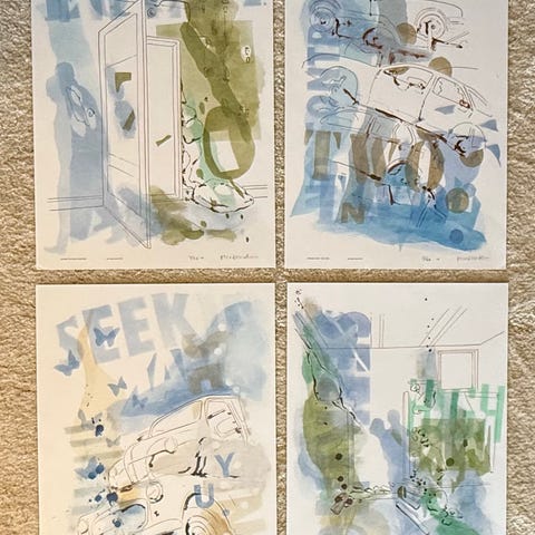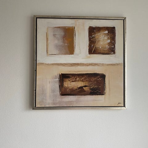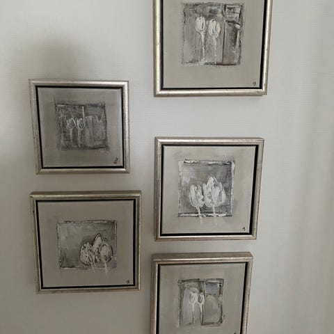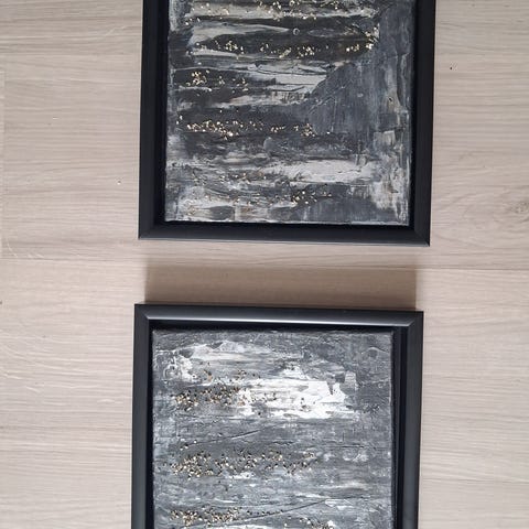 Abstrakte malerier sæt bestående af tre kvadratiske billeder i grå, hvid og sorte nuancer. Motiverne er geometriske og non-figurative med penselstrøg, felter og linjer. Hvert maleri er monteret i en sølvfarvet/sort ramme med mørk inderkant. Egnet til ophæng i stue, kontor eller gang, hvor der ønskes et sammenhængende udtryk på væggen. Hvert maleri måler 33 × 33 cm.