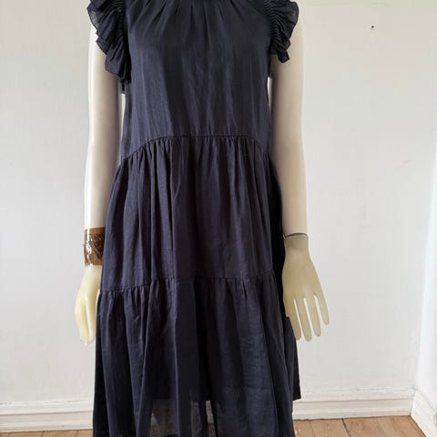 Kjolen er i sort bomuld. Modellen har v-udskæring, korte flæseærmer og skørt med let vidde, i et let og behageligt materiale.