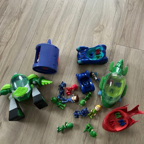 Pyjamasheltene figurer og køretøj. Sættet består af flere figurer fra Pyjamasheltene-universet samt et lille køretøj. Figurerne forestiller forskellige helte og skurke fra serien og er velegnede som legetøj til rolleleg. Plastmateriale med faste dele, uden løse smådele på figurerne. Passer til børn, der kan lide Pyjamasheltene og superhelteleg.