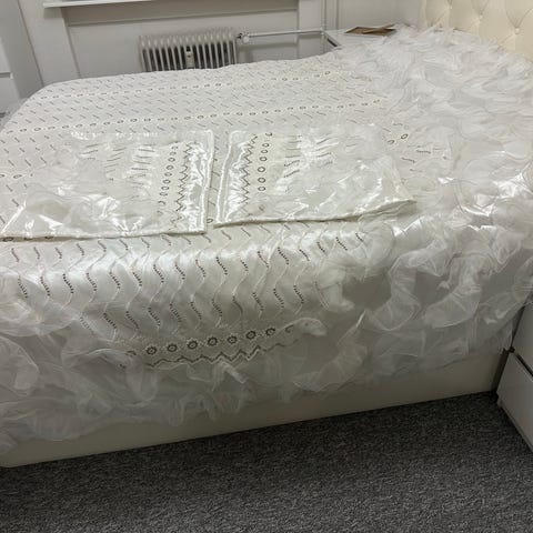 Dette produkt er et sengetæppesæt i jacquardstof med flæsekantede kanter, der tilføjer en klassisk, kongelig finish til soveværelset
