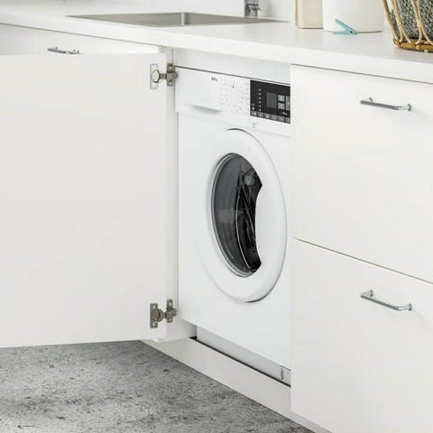 Her får du en 2-i-1 vaskemaskine/tørretumbler med dampprogram og andre funktioner, der gør det nemt at tilpasse den til dine vaskebehov. Hvis du vil skjule den, kan du supplere med et skab med låge.