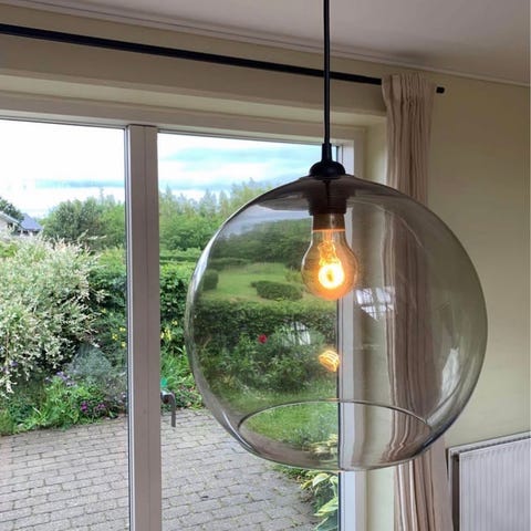 Super flot pendel i rillet glas med guld detalje. Giver et rigtig flot spil i rummet. Stor dekorationspære medfølger.