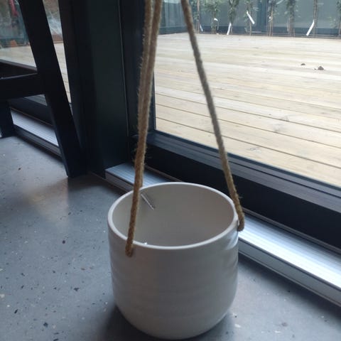 hængepotte med remme. Potten er udført i et ler materiale og , og den hænger i to remme, som gør den egnet til ophæng på væg eller i loft. Velegnet til mindre planter eller som dekorativ opbevaring i hjemmet. Der er plastik interpoleret i ..13 cm diameter 12 cm høj