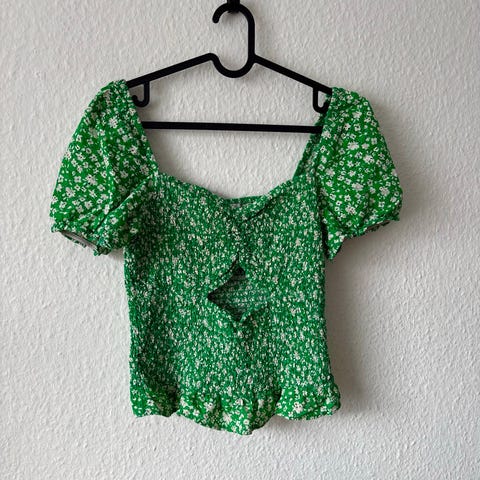 H&M T-shirt til kvinder i størrelse XS. Modellen er kort og figursyet med elastisk, rynket struktur og korte ærmer. T-shirten har en multifarvet overflade i lyse nuancer og er fremstillet i polyester. Velegnet som sommertop eller til hverdagsbrug.
