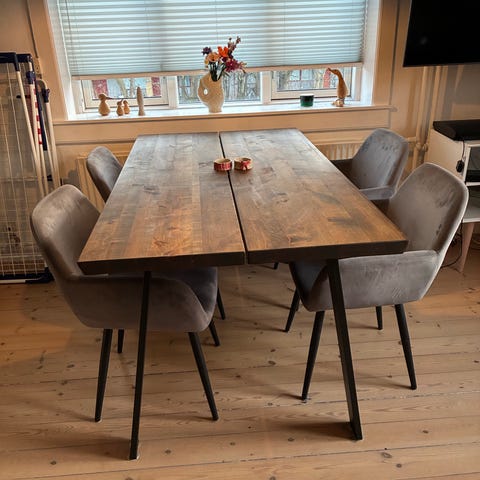 Plankebord i en god størrelse, der passer perfekt. Bordet har en enkelt plamage, men da det er massivt træ, kan det nemt fikses med en let slibning og en ny omgang olie, så det står som nyt igen.