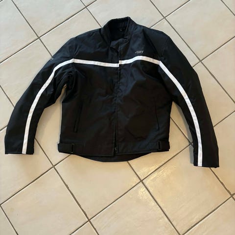 Course motorcykeljakke i str. 54. Jakken er sort med lyse refleksstriber over bryst og overarme. Den har høj krave, lynlås foran samt justerbare stropper ved ærmer og i livet for bedre pasform. Indersiden er glatforet for øget komfort med aftageligt thermo for. Velegnet som beskyttende overtøj til motorcykelkørsel.