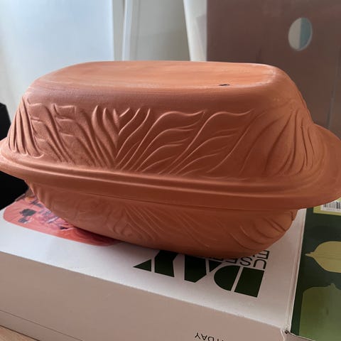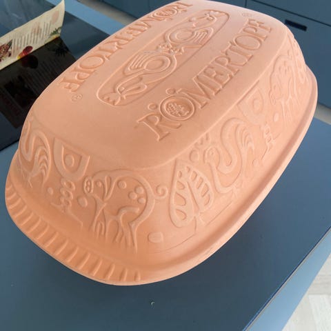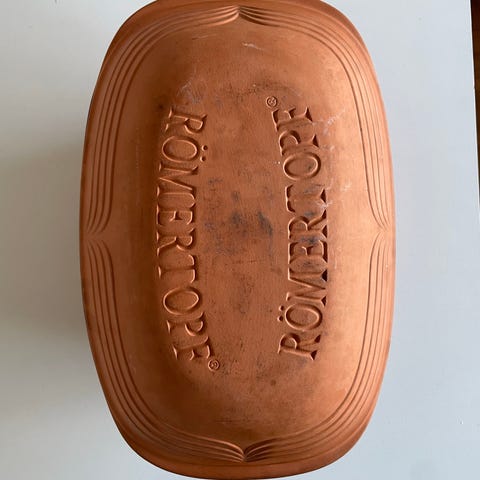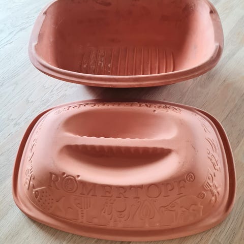 stegeso i ler med låg. Rektangulær form med mønster på sider og låg. Fremstillet i uglaseret terrakotta/ler, egnet til tilberedning af retter i ovn, fx brød, kød og grøntsager. Består af underdel og tilhørende låg. Bunden er mærket med modelnummer og oprindelsesland (West Germany). Velegnet som ovnfast fad til langsom tilberedning og braisering i køkkenet.