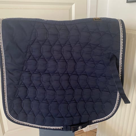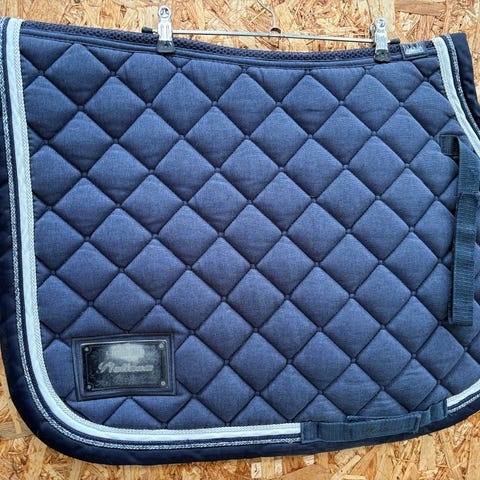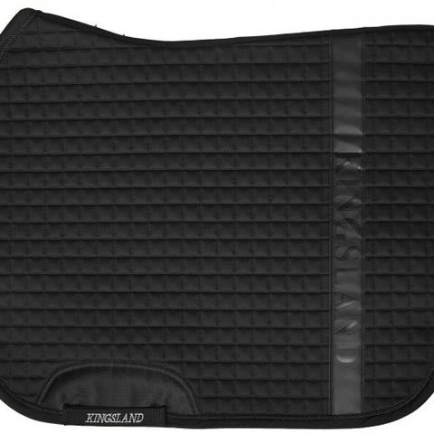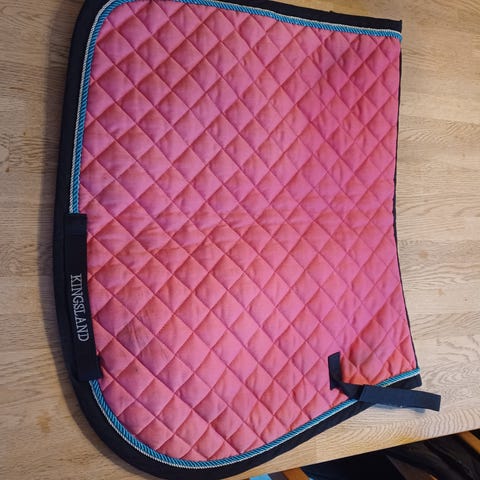Kingsland pony sadelunderlag i mørkeblå farve. Underlaget har kviltet mønster og stropper til fastgørelse ved sadlen. Egnet til pony og kan bruges til daglig ridning eller træning. Materialet fremstår som blødt og polstret for at give komfort mellem sadel og ponyens ryg.