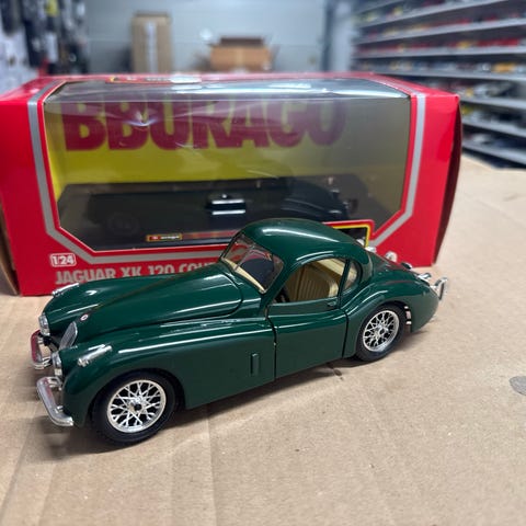 Bburago Jaguar XK 120 Roadster modelbil i grøn med lyst interiør. Skalamodel af klassisk cabriolet, leveres i original Bburago-æske. Detaljeret karrosseri med kromdetaljer, fælge og interiør. Egnet som samlerobjekt eller udstillingsmodel.