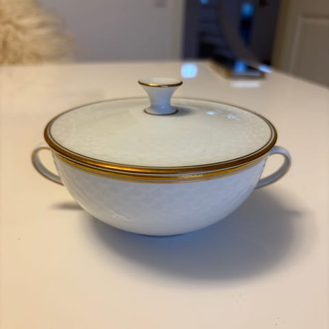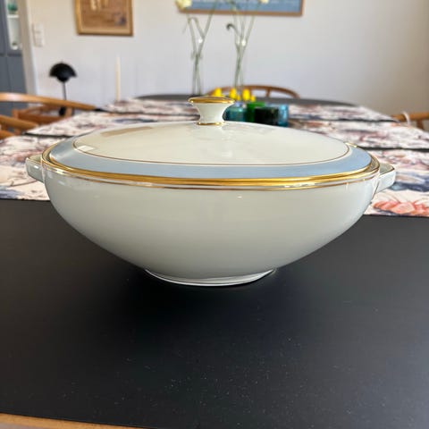 Bing & Grøndahl skål i porcelæn. Skålen er hvid med guldkant langs øverste kant og fod samt gulddetaljer på de to sidehanke. Rund form med let profileret yderside. Diameteren er ca. 20 cm, som vist på billedet med målebånd. Velegnet som serveringsskål til fx tilbehør, salat eller dessert. Bunden er mærket med Bing & Grøndahl stempel "B&G Copenhagen Denmark".