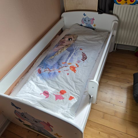Disney Frost juniorseng med Olaf og Anna/Elsa motiv i blå og hvid. Sengen har sider og gavle i malet træ/komposit med trykte Frost-figurer. Bund består af flere plader, der bærer madrassen. Velegnet som overgangsseng til mindre børn. Der medfølger en løs blå tekstil-del med bladmotiv, som kan bruges til opbevaringselement; stoffet har en synlig rift. Sengen har nogle få bruger spor