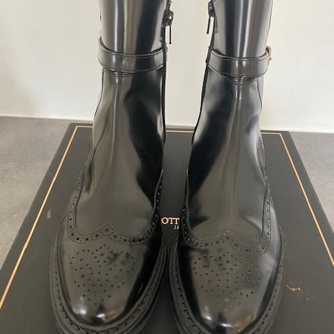 Geox støvler i størrelse 44 i sort læder. Klassiske ankelstøvler med brogue-inspirerede perforeringsdetaljer på snude og sider. Glat overlæder og læderfor indvendigt. Flad hæl og solid ydersål. Velegnet som pæne hverdags- eller dress-støvler.
