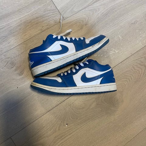 Air Jordan 1 Low SE sneakers i str. 43. Modellen er i blå og hvid med klassisk Nike Swoosh på siderne. Lav skaftmodel med snørelukning og perforeret tå for ventilation. Overdel i syntetisk materiale og læderlook, mellemsål i skum og gummisål med mønster for greb. Velegnet som hverdagssko og fritidssko.